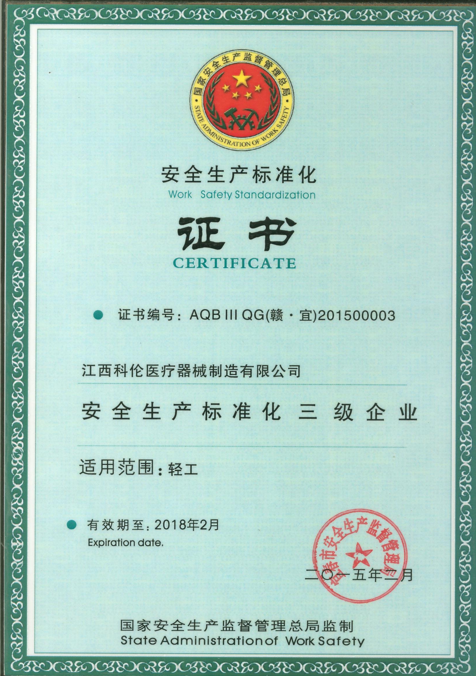 2015年2月获得安全生产标准化三级企业